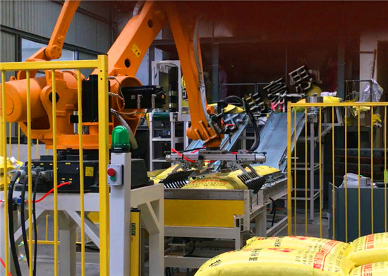 5、抓袋碼垛機(jī)構(gòu)。采用機(jī)器人碼垛機(jī)構(gòu)完成碼垛作業(yè)。