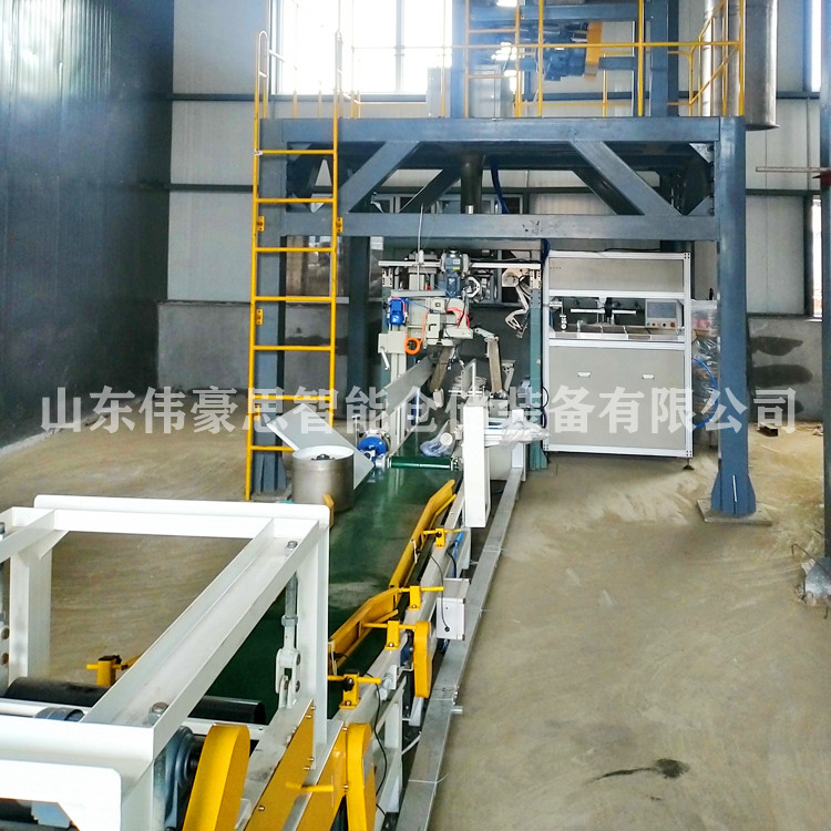 通過(guò)氣力輸送系統(tǒng)將物料輸送至?xí)捍媪蟼}(cāng)中(料倉(cāng)容積可自訂大小),通過(guò)料位感應(yīng)器感應(yīng),當(dāng)料倉(cāng)沒(méi)料時(shí),所有設(shè)備不工作;當(dāng)有料時(shí),感應(yīng)器反饋信號(hào)給包裝秤,包裝秤開(kāi)始自動(dòng)稱(chēng)重,與此同時(shí),自動(dòng)上袋機(jī)也開(kāi)始自動(dòng)上袋,當(dāng)袋口被套在包裝秤夾袋器上時(shí),包裝秤秤斗開(kāi)始放料,動(dòng)作完成后,上袋機(jī)抱袋裝置通過(guò)皮帶輸送將料袋送至縫包機(jī)中,并開(kāi)始縫包工作,當(dāng)動(dòng)作完成后,料袋隨皮帶輸送機(jī)送至倒帶整形機(jī)中,在料袋送至倒袋整形之前并完成自動(dòng)噴碼工作,倒袋整型機(jī)會(huì)先將立著的料袋打倒并旋轉(zhuǎn)90度,隨后通過(guò)整形壓滾將包裝不均勻的物料壓平,并輸送至重量檢測(cè)機(jī)和金屬檢測(cè)機(jī)中,當(dāng)檢測(cè)好后,通過(guò)剔除機(jī)時(shí),不合格的產(chǎn)品將會(huì)被剔除,合格的產(chǎn)品將通過(guò)提升輸送機(jī)送至抓取段輸送機(jī)中,與此同時(shí),需人工從托盤(pán)庫(kù)中將空托盤(pán)送至輸送機(jī)上,當(dāng)料袋和托盤(pán)準(zhǔn)備就位時(shí),機(jī)器人開(kāi)始抓取料袋并碼垛,當(dāng)碼垛完成時(shí),輸送機(jī)將堆碼送至在線纏繞機(jī)上,并完成纏繞工作,并繼續(xù)下一批包裝堆碼工作。