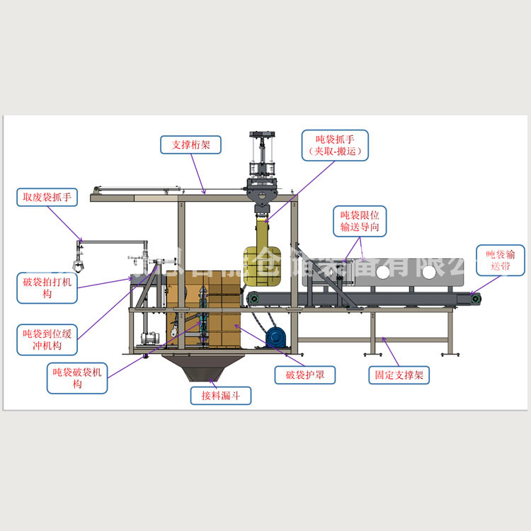脫硫劑全自動(dòng)噸袋拆包機(jī)能對(duì)一些有毒、易燃、強(qiáng)腐蝕、高粉塵和工作人員不易接觸的場合代替人工進(jìn)行噸袋拆包作業(yè),它主要用于500-2500KG噸袋物料的連續(xù)拆包,實(shí)現(xiàn)噸袋輸送、全自動(dòng)拆包、廢袋自動(dòng)打包等自動(dòng)化生產(chǎn),脫硫劑全自動(dòng)噸袋拆包機(jī)儼然成為粉體行業(yè)解決粉塵污染的得力助手。