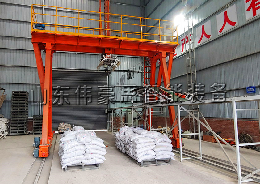 運輸車一側(cè)的機械手從下方輸送線上抓取料袋裝車.