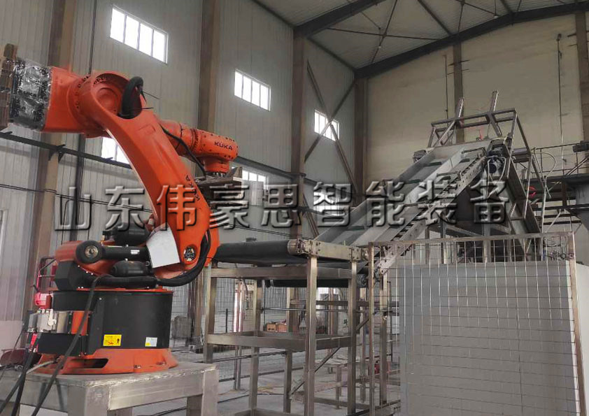 硅粉自動拆垛拆包設備實現(xiàn)直接上料拆包自動化,兩者的結合除叉車上垛外,無需人工操作,它是由機器人抓手將要拆卸的物料袋抓取提升至割袋裝置上方,由割袋裝置拆包,物料落入儲料罐內,機器人抓手通過抖動清空料袋。
