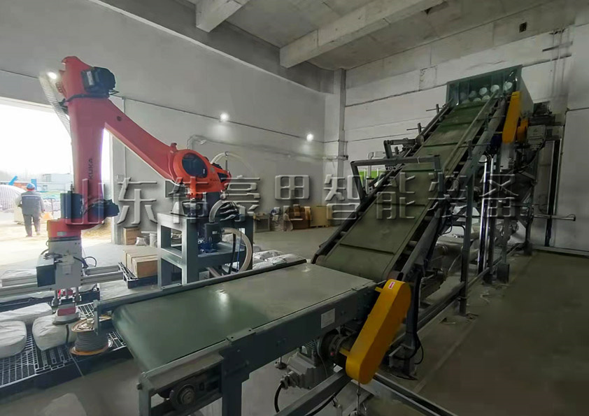 為了給企業(yè)減少人工投入,山東偉豪思在自動(dòng)破袋機(jī)的前端配套上機(jī)器人拆垛機(jī),實(shí)現(xiàn)自動(dòng)上料,為企業(yè)減少了人工,我們稱為自動(dòng)破袋機(jī)器人。