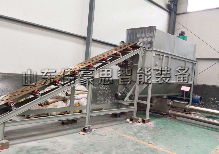 3.袋子在自動拆袋機內,經過割刀,滾筒篩,螺旋輸送機,廢袋輸送機作用后,物料由輸送機(螺旋輸送機、管鏈式輸送機等其它輸送設備)輸送出來到達指定地點。