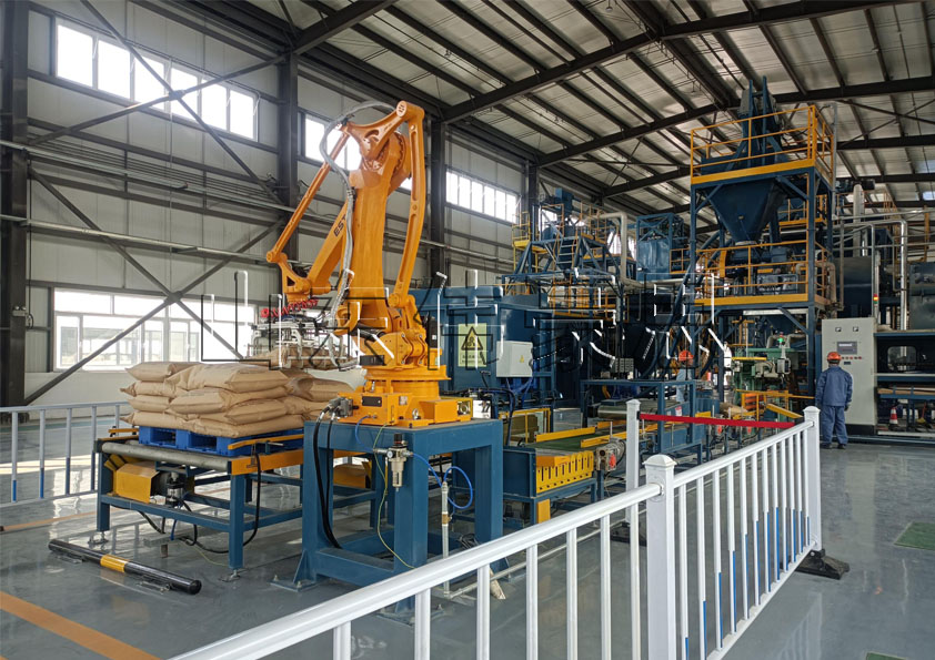 碳酸鈣全自動(dòng)包裝碼垛線的工作流程: