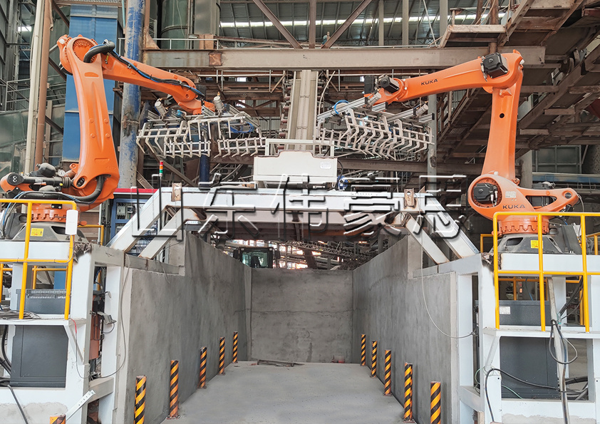 運(yùn)輸車一側(cè)的機(jī)器人從下方輸送線上抓取料袋裝車,2臺機(jī)器人分區(qū)作業(yè)且有聯(lián)動防碰撞功能,在工作中互不干涉。2臺機(jī)器人可同時(shí)裝車。