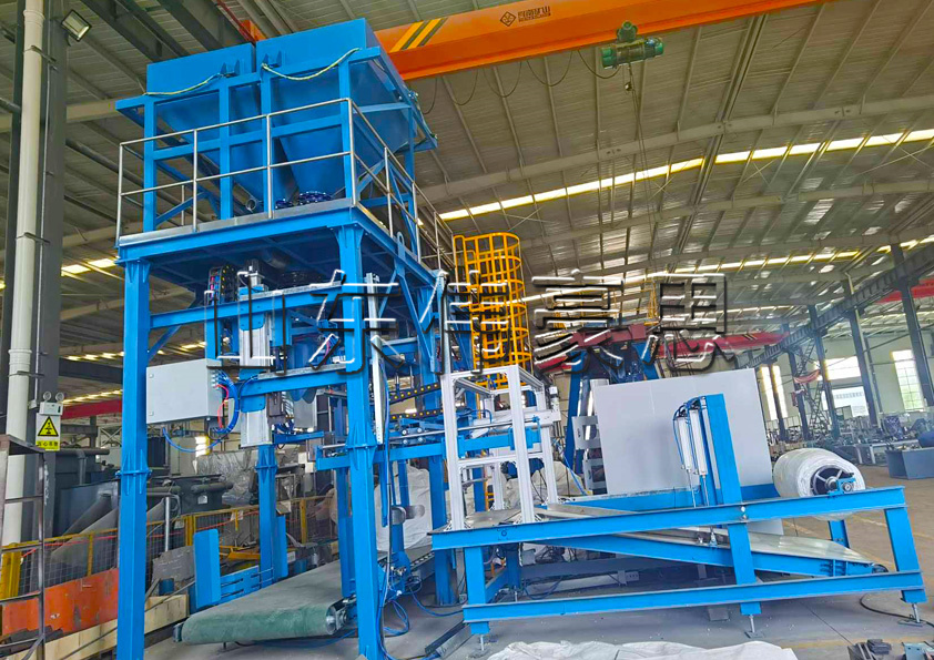 1.準(zhǔn)備階段:噸袋按照150條袋子的規(guī)格卷成一卷,叉車將整捆包裝袋放入袋框,空包裝袋在輸送機(jī)上前移。