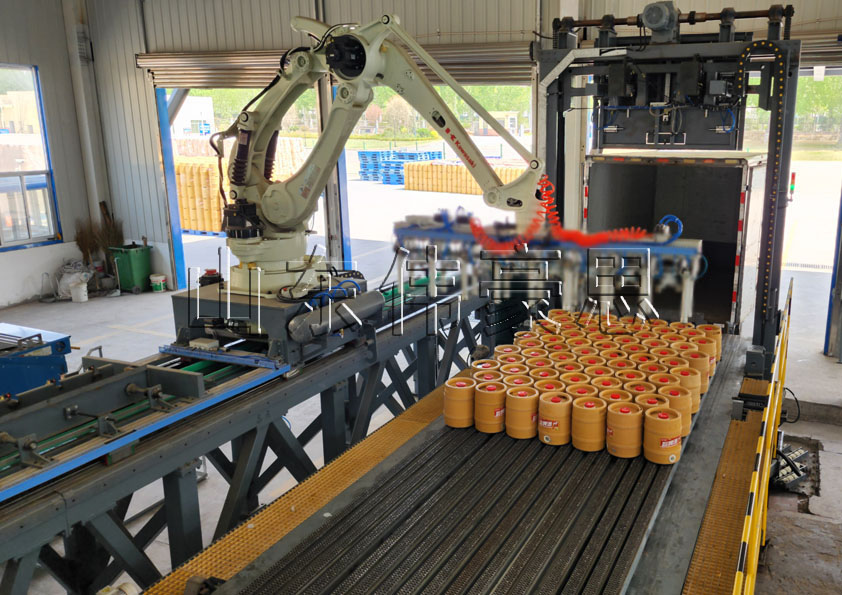 啤酒桶通過(guò)緩沖輸送線進(jìn)入待抓取輸送線,輸送線排序進(jìn)入待抓取位,機(jī)器人抓取啤酒桶至裝車(chē)機(jī)推板上碼垛,待推入車(chē)廂。貨車(chē)進(jìn)入停車(chē)位,通過(guò)傳感器檢測(cè)車(chē)輛整體及偏移尺寸,裝車(chē)機(jī)通過(guò)高低、前后、左右角度旋轉(zhuǎn)各個(gè)方向進(jìn)行位置調(diào)整,將裝車(chē)機(jī)和車(chē)廂對(duì)齊,推板將貨物推送至車(chē)廂內(nèi),落下龍門(mén)架檔板,止擋抵住貨物,抽出推板,完成裝車(chē)。