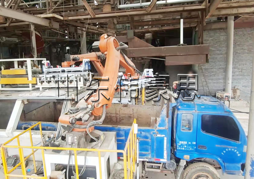 運輸車一側的機器人從下方輸送線上抓取料袋裝車,2臺機器人分區(qū)作業(yè)且有聯(lián)動防碰撞功能,在工作中互不干涉。2臺機器人可同時裝車。