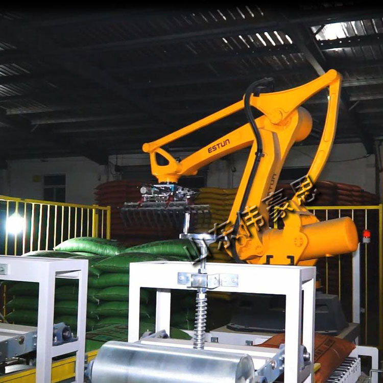 有機肥碼垛機器人執(zhí)行的多是抓放操作,即機器人從傳送帶上抓取物料,沿運動路徑將其放置在托盤上指定位置的動作循環(huán)。故根據(jù)機器人在完成碼垛作業(yè)時其與傳送帶及托盤的位置關(guān)系,綜合考慮運動過程障礙物情況,選用“門”字形運動軌跡。注意到機器人末端執(zhí)行器在完成托盤上不同位置紙箱的碼放時,所走軌跡均為“門”字形,僅因紙箱在托盤上位置不同導(dǎo)致軌跡終點坐標(biāo)不同。所謂碼垛是按照集成單元化思想,將物料按照一定模式堆碼成垛,以便使單元化的物垛實現(xiàn)物料的存儲、搬運、裝卸、運輸?shù)任锪骰顒印Ec傳統(tǒng)的人工碼垛及龍門式碼垛機相比,碼垛機器人因其生產(chǎn)效率高、占地空間小、動作靈活性大、人工勞動強度低等特點,逐漸被應(yīng)用到各個領(lǐng)域中。