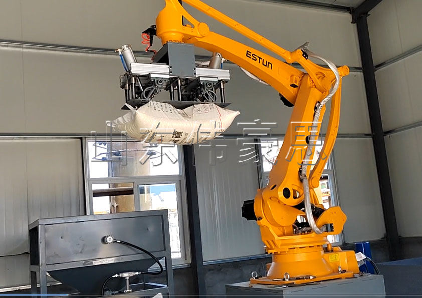 工業(yè)鹽自動(dòng)拆包機(jī)器人是由自動(dòng)拆垛機(jī)器人和自動(dòng)拆包機(jī)組成的,兩者的結(jié)合除叉車(chē)上垛外,無(wú)需人工操作,它是由機(jī)器人抓手將要拆卸的物料袋抓取提升至割袋裝置上方,由割袋裝置拆包,物料落入儲(chǔ)料罐內(nèi),機(jī)器人抓手通過(guò)抖動(dòng)清空料袋。