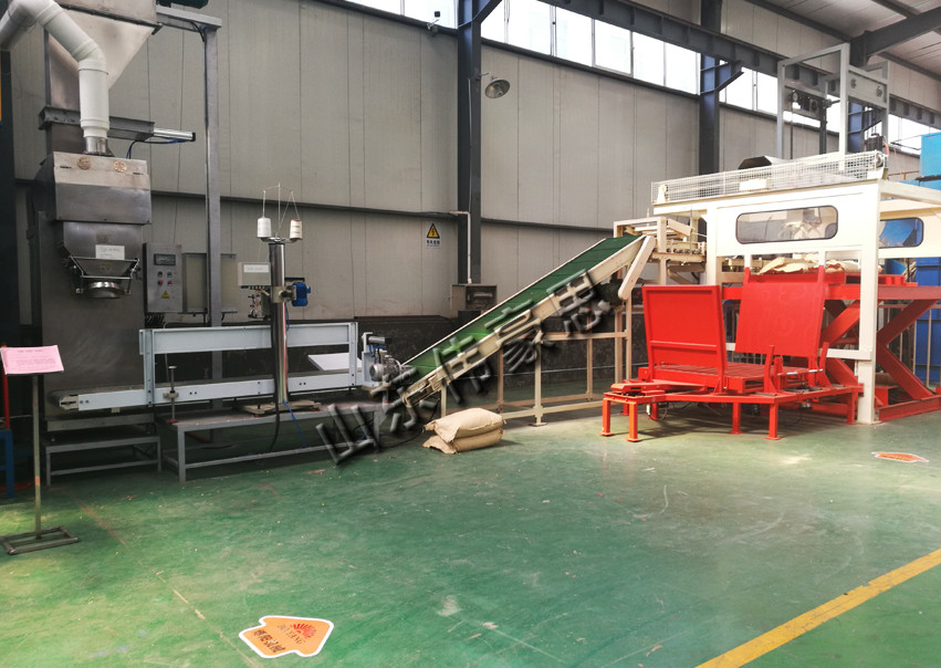 7、人工用叉車把碼完垛的平臺(tái)移送至指定的成品袋子存放區(qū)域。