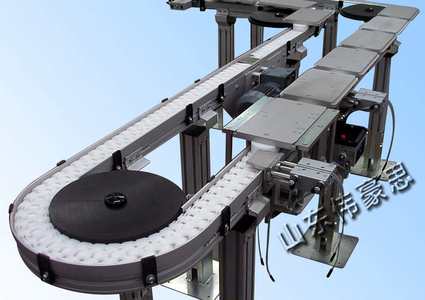平頂鏈輸送線可以完成平面輸送、平面轉(zhuǎn)彎、提升下降等各種功能。