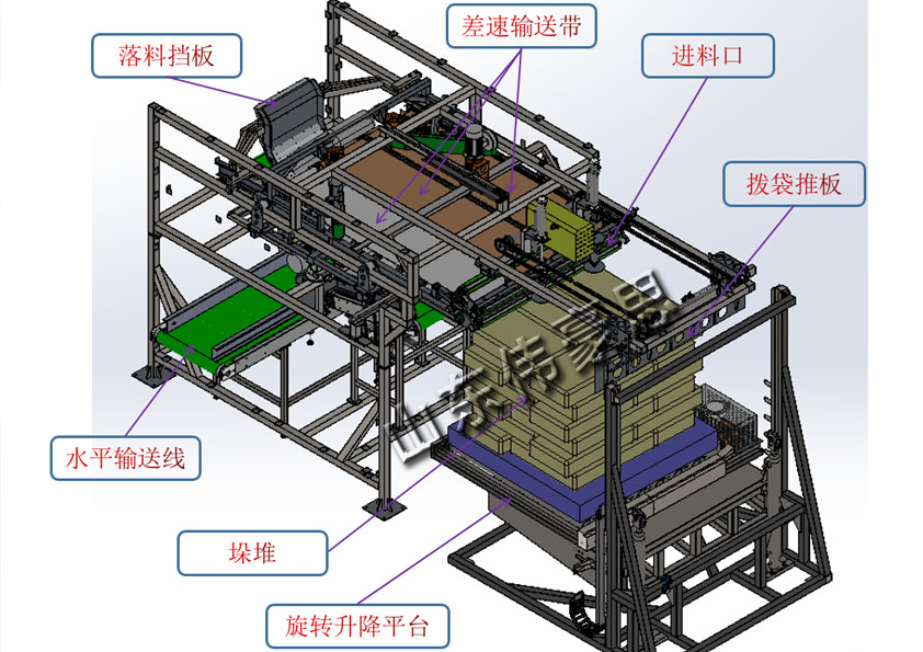 差速式拆垛機(jī)可以實(shí)現(xiàn)五花垛或六順垛的連續(xù)差速拆垛,料袋整平,使料袋進(jìn)入生產(chǎn)線。主要組成部分有:旋轉(zhuǎn)升降平臺(tái)、活動(dòng)差速輸送平臺(tái)、落料輸送線以及壓平整形機(jī)構(gòu)、水平輸送線等部分;