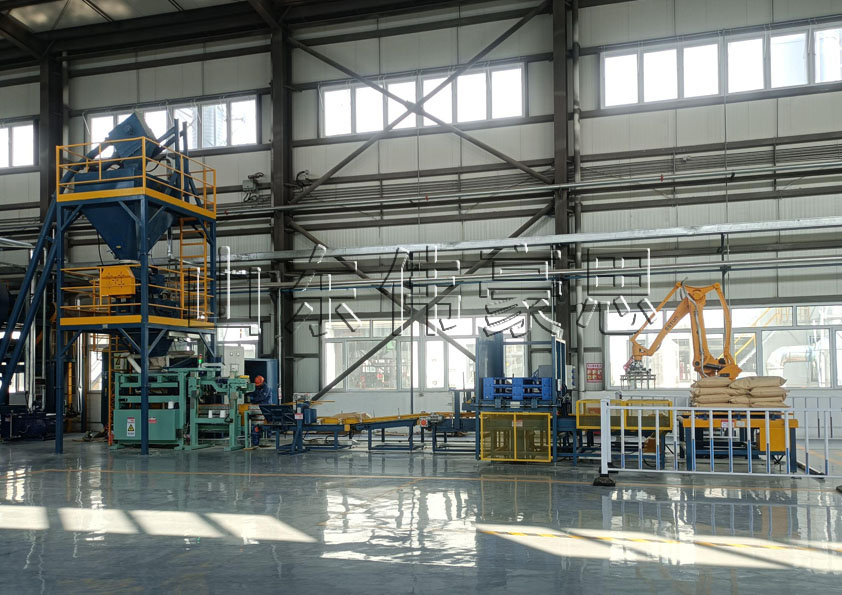 6、包裝好的袋料可通過機械手碼垛機將袋料碼到垛盤或者噸包里。實現(xiàn)包裝碼垛無人化、自動化。