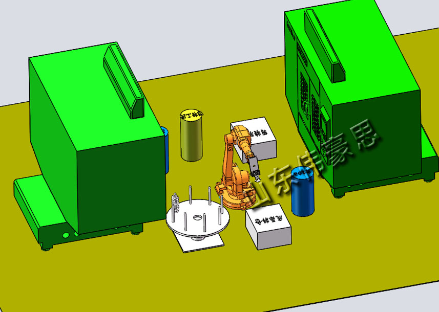 3、一臺機器人給二臺數(shù)控機床上下料,大大提高生產效率,提高設備的稼動率。